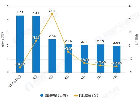 據(jù)國家統(tǒng)計局統(tǒng)計數(shù)據(jù)顯示,2019年1-2季度湖南省合成洗滌劑產(chǎn)量有所下降,2019年7月湖南省合成洗滌劑產(chǎn)量為2.15萬噸,同比下降14.68%。2019年1-8月湖南省合成洗滌劑產(chǎn)量為19.75萬噸,同比下降1...