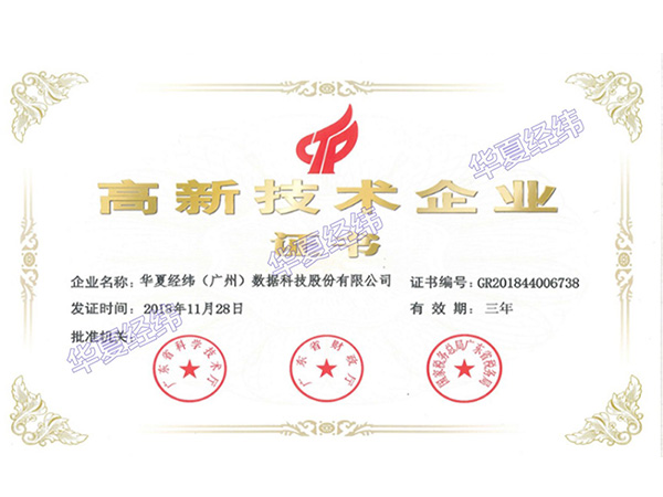 2018年12月16日,華夏經(jīng)緯(廣州)數(shù)據(jù)科技股份有限公司通過(guò)了由廣東省科技廳、廣東省財(cái)政廳、國(guó)家稅務(wù)總局廣東省稅務(wù)局組織的國(guó)家高新技術(shù)企業(yè)認(rèn)定,并榮獲國(guó)家“高新技術(shù)企業(yè)”稱號(hào),由此正式邁入國(guó)家高新技術(shù)企業(yè)行列。