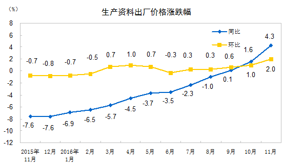 2016年11月份工業(yè)生產者出廠價格同比上漲3.3%