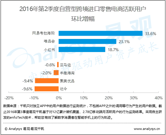 自營(yíng)型跨境進(jìn)口零售電商中,承載其業(yè)務(wù)APP的活躍用戶表現(xiàn)出了較明顯的差距:網(wǎng)易考拉海購(gòu)以33.6%的增長(zhǎng)態(tài)勢(shì)處于第一,其在郵箱、新聞、音樂(lè)、游戲等領(lǐng)域的用戶協(xié)同效應(yīng)逐漸被釋放出來(lái)。唯品會(huì)與小紅書差距不大,分列以23.1%和18.7%居于第二、第三位,其余的主要廠商,第2季度的活躍用戶環(huán)比都為負(fù)增長(zhǎng)。