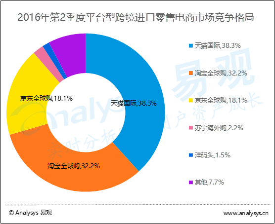 在平臺(tái)型跨境進(jìn)口零售電商中,阿里巴巴旗下的天貓國(guó)際、淘寶全球購(gòu)居于領(lǐng)先地位,其份額分別達(dá)到了38.3%和32.2%,而京東全球購(gòu)緊隨其后,擁有18.1%的份額;以上三個(gè)平臺(tái)占據(jù)了平臺(tái)型跨境進(jìn)口零售市場(chǎng)中近九成的份額,遙遙領(lǐng)先于其他廠商,在市場(chǎng)中有絕對(duì)的影響力。另外,蘇寧海外購(gòu)、洋碼頭分別以2.2%和1.5%的份額排在第四、第五位,其還有進(jìn)一步擴(kuò)大市場(chǎng)份額的空間。