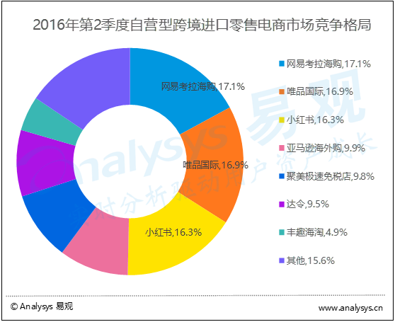在自營(yíng)型跨境進(jìn)口零售電商中,相對(duì)平臺(tái)型而言較為分散,各廠商的競(jìng)爭(zhēng)更為激烈。網(wǎng)易考拉海購(gòu)以17.1%的份額排在第一位,唯品國(guó)際與小紅書分別以16.9%和16.3%的份額排在第二、第三位。市場(chǎng)中前三位占據(jù)剛好過(guò)半的份額,處于第一梯隊(duì),相對(duì)于其他廠商而言,有較明顯的領(lǐng)先優(yōu)勢(shì)。亞馬遜海外購(gòu)、聚美極速免稅店、達(dá)令的市場(chǎng)份額較為接近,處于第二梯隊(duì)。