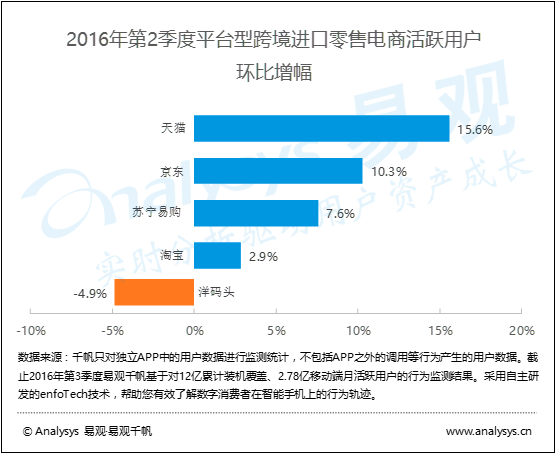 平臺(tái)型跨境進(jìn)口零售電商中,承載其業(yè)務(wù)APP的活躍用戶表現(xiàn)出了一定的差異:天貓和京東相對(duì)較高,分別為15.6%與10.3%;淘寶的活躍用戶增長(zhǎng)較低,只有2.9%;蘇寧易購(gòu)介于二者之間,為7.6%;而洋碼頭則出現(xiàn)了負(fù)增長(zhǎng),為-4.9%。這表現(xiàn)出了用戶的選擇偏好有朝B2C模式的平臺(tái)型電商集中的趨勢(shì)。