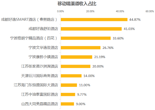 從數(shù)據(jù)上來看,上榜酒店的移動(dòng)端渠道收入占比依舊主要集中在10%—40%之間。很多酒店不愿在酒店移動(dòng)互聯(lián)網(wǎng)直銷化精力而寧愿與OTA渠道合作,主要原因是不知道互聯(lián)網(wǎng)直銷為酒店能帶來怎樣的收益。從這些榜單數(shù)據(jù)可以清晰的看到,只要酒店用心去做,移動(dòng)互聯(lián)網(wǎng)直銷渠道將為酒店帶來更多利潤。