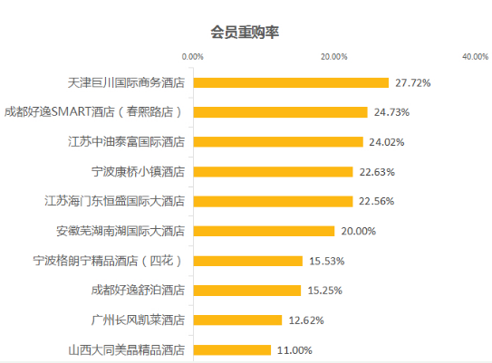 從榜單上來看,6月份的TOP10會(huì)員重購率環(huán)比5月份相差不大,呈穩(wěn)定狀態(tài)。其中,天津巨川國際商務(wù)酒店以27.72%的會(huì)員重購率霸占了榜單首位,可喜可賀。另外,與往月類似,6月份的TOP10中大部分酒店的會(huì)員重購率依舊保持在20%—30%之間,沒有出現(xiàn)明顯的斷層現(xiàn)象。