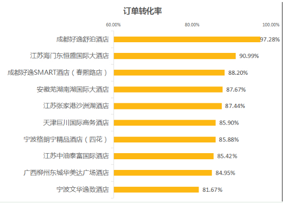 在數(shù)據(jù)中我們可以看到,榜單中的前十名酒店訂單轉(zhuǎn)化率都維持在80%以上,尤其是第一名的好逸舒泊酒店,轉(zhuǎn)化率高達(dá)97.28%,相信與其優(yōu)質(zhì)的服務(wù)和良好的用戶體驗(yàn)是分不開的。