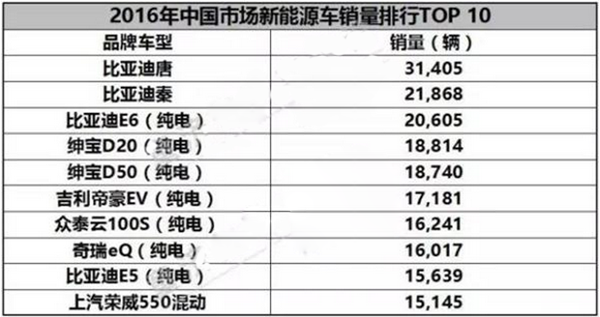 聊完美國(guó)市場(chǎng),我們?cè)侔岩暰€轉(zhuǎn)移到中國(guó)國(guó)內(nèi)市場(chǎng)。從乘聯(lián)會(huì)發(fā)布的2016年新能源汽車銷量數(shù)據(jù)來(lái)看(進(jìn)口車型沒(méi)有計(jì)入其中),比亞迪包攬前三甲,銷量均在2萬(wàn)輛以上,比亞迪唐更是突破了3萬(wàn)輛的門檻。